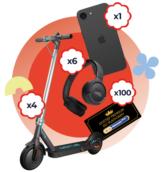 Uwaga: Nagrody rzeczowe (telefon, hulajnogi, słuchawki) podlegają 10% zryczałtowanemu podatkowi (zgodnie z obowiązującym prawem) i żadnej z nich nie można wymienić na gotówkę. Aby skorzystać z nagrody w postaci dostępu Premium, zwycięzcy muszą posiadać konto w serwisie maturzysta.edu.pl (założenie konta jest bezpłatne).